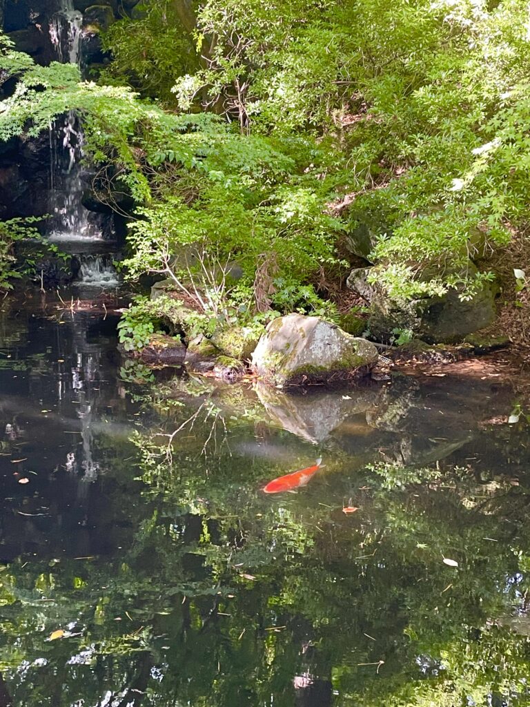 緑豊かなお庭には、水の音が心地よい小さな滝や鮮やかな鯉がいて、癒し度満天です。
